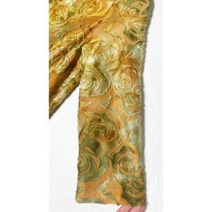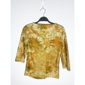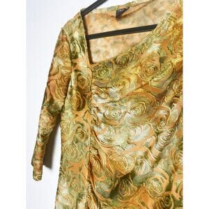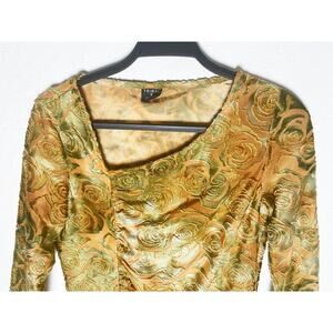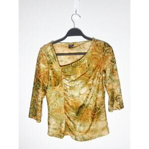 Vintage Tribal Women's Top Asymmetrical Neck Side Ruching Embossed Floral Velvet Mustard Gold Green