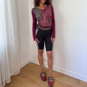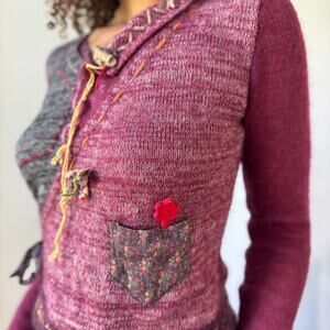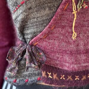 Mulberry & charcoal mixed-yarn knit top featuring hand-stitched contrast seams, mixed-media appliqués, floral pocket detail and wrap-style tie. From Italian knitwear house Tricot Chic (est. 1972), known for Italy-made, intricately crafted knits. Made in Italy. Free shipping on bundles <3