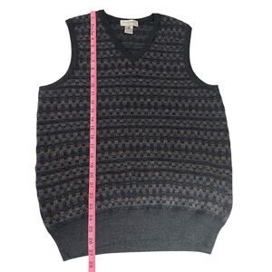 Vintage Tricots St. Raphael 100% Merino Wool Sweater Vest. V-neck, ribbed trim. Geometric pattern. Dark gray. Size large. Please see photos for measurements.
