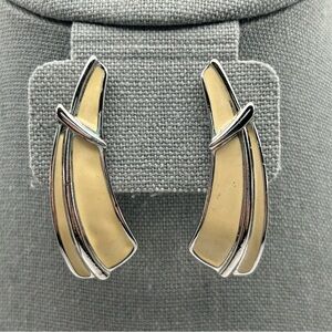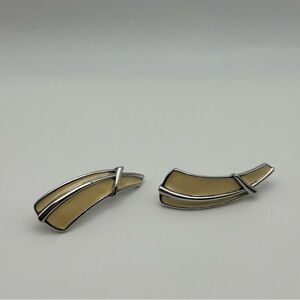 Vintage Trifari Abstract Long White Cream Enamel Stud Statement Earrings with Silver Tone Stripes