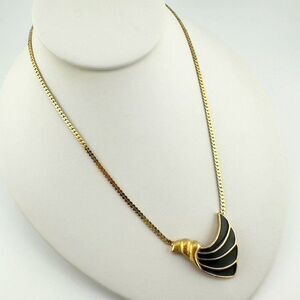 Vintage Trifari 70s 80s Black Enamel Gold Tone Chain Nautical Seashell Wave Necklace & Earring Set. Necklace is 16" and earrings are for pierced ears and 1 inch tall by 3/4 inch wide. No backs to earrings. Good pre-owned condition with light surface wear such as scuffs or tarnish consistent with age & normal use.