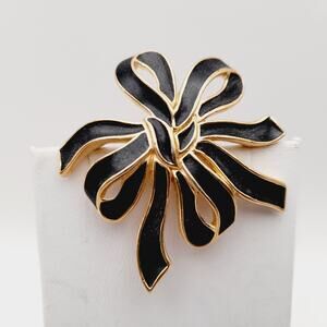Vintage Trifari Black Enamel Ribbon Brooch; Gold Plated Designer Costume Jewelry