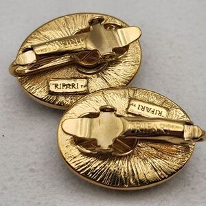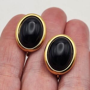 Vintage Trifari black oval cabochon Lucite clip on earrings in gold tone. Approximate size is 1". Perfect for adding a touch of vintage elegance to any outfit. They are in excellent vintage condition. Please feel free to ask questions.