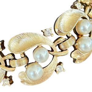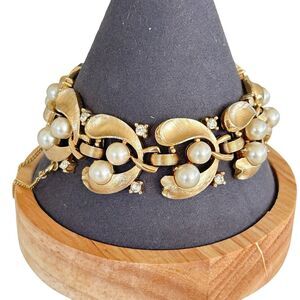 Vintage Trifari Bracelet Gold Tone Faux Rhinestones Pearls Ornate Statement. Good pre-owned condition with normal vintage wear, see photos for details. Measurements in photos and are approximate. Display not included.