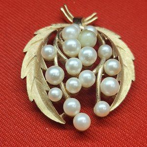 Vintage Trifari Gold Tone Faux Pearl Leaf Brooch Pin