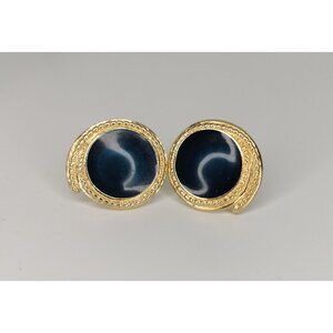 - A captivating pair of vintage Trifari earrings showcasing a gold-tone finish with a striking blue centerpiece. These round post earrings exude timeless elegance and a retro aesthetic, perfect for elevating your jewelry collection. Crafted with precision, they reflect Trifari's renowned craftsmanship and attention to detail, embodying a sophisticated blend of style and history.
