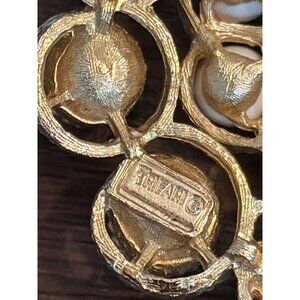 This Trifari brooch captures the essence of timeless elegance. Its floral design features lustrous white cabochons set in intricate gold-tone frames, exuding sophistication and charm. A true statement accessory for adding vintage allure to your collection or outfit.