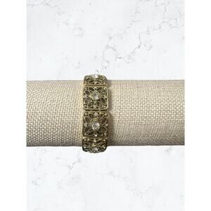 Beautiful Trifari bracelet featuring five ornate gold-tone filigree panels accented with sparkling clear rhinestones. Each square panel has an openwork floral design with a bright center stone — elegant, classy, and easy to pair with any outfit.