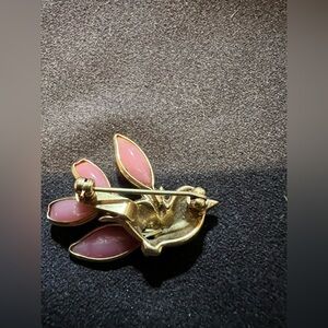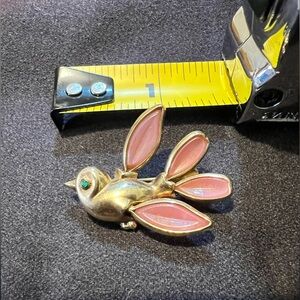 This is a Trifari bird with Gripoix glass pink wings. It is designed by Alfred Philippe so very sought after design per research. Gold tone pin and closure in good shape. Vintage, bird, poured glass