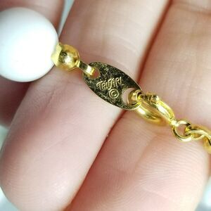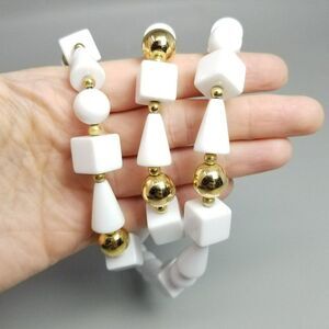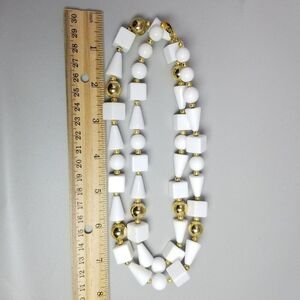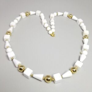 Vintage Trifari White and Gold Tone Long Plastic Beaded Necklace, Funky Shapes