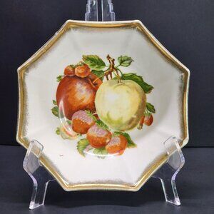This Vintage Trimont Ware Japan Porcelain Bowl boasts a stunning hand-painted fruit design, complemented by a 7'' gold trim. An elegant addition to any collection or table setting.