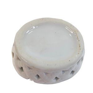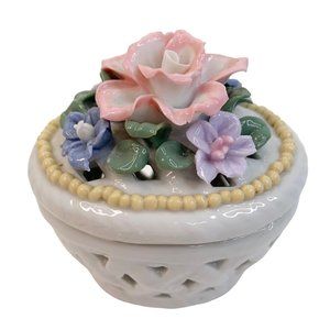 Vintage Trinket Box Applied Rose Flowers Reticulated Lattice Basket Jewelry Ring