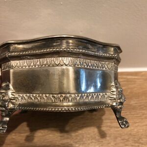 Vintage international silver company made in Hong Kong. Footed trinket box, Jewelry Box, Casket in great condition. Silver plate has warm aged patina. Lions feet and Lions head the detail is beautiful. Velvet lining. Crest on top of box is the Code of arms United Kingdom “Inoh Pense Dieu Et Mon Droit”. Meaning “God and My Right” which is the Motto of the Monarch of the United Kingdom outside Scotland.