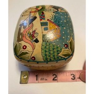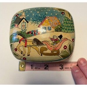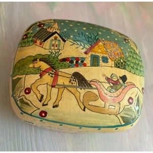 Beautiful collectible trinket box, made in India, featuring a beautiful and colorful winter scene, a horse and sleigh with two riders, holly and berries, a church style building, a house style building, trees and snow. The picture is trimmed in blue with blue polka dots adorning the sides of the box. The background is cream, which shows some yellowing lacquer due to age. The interior of the box and the bottom are black. I do not know what the box material is made of but I believe this to be a hand made lacquered Indian paper mache box. It is light weight. The lid stays on because of the lip that I have shown in the pictures.