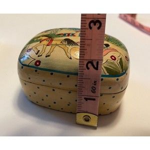 TAGS: vintage, sleigh ride, holidays, horse, polka dots, collectible, trinket box, gift, nostalgia, folk art, Christmas, winter, Knick Knack Box, rounded Rectangular keepsake box, Bohemian Decor, painted, ethnic, colorful, rustic, detailed, lacquer box, MCM, mid century modern