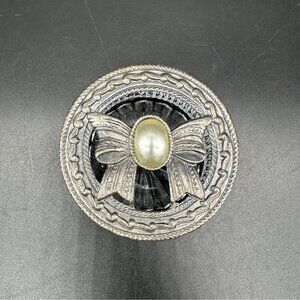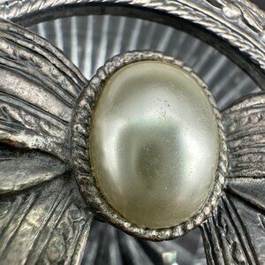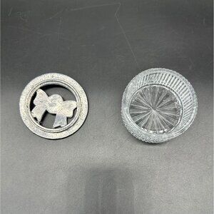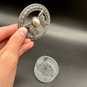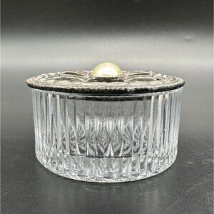 Vintage Trinket Dish Vanity Jewelry Jar Pewter Glass Faux Pearl Cabochon Cottage