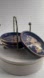 Set of three elegant blue decorative trinket trays featuring intricate gold and purple designs. Perfect for display.