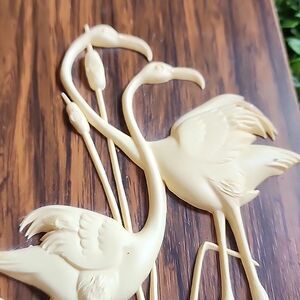 Vintage Celluloid and Wood Panel Trio with Angel Fish, Birds and Flamingos.