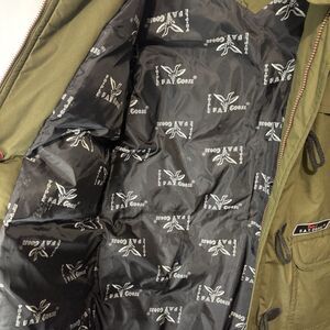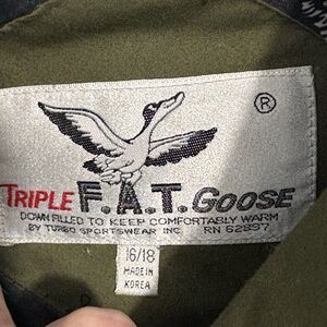 The Vintage Triple F.A.T. Goose Puffer Coat Parka Jacket in size 16/18 XL is a stylish and functional outerwear piece perfect for various occasions like travel, casual wear, and workwear. This jacket features a cotton blend outer shell, polyester lining, and insulated with down for added warmth during the winter and fall seasons. With a mid-length design, removable hood, full zip closure, and water and wind-resistant properties, this classic puffer jacket is both practical and fashionable, reflecting a vintage style with accents like fur trim and a logo detail. Made in Korea, this jacket is a timeless addition to any wardrobe.