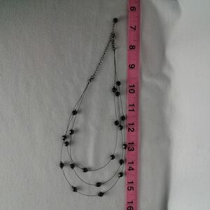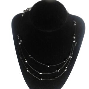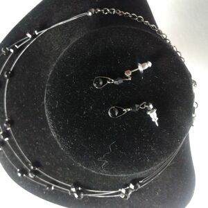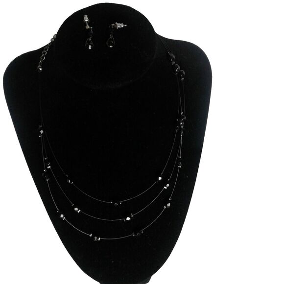 Vintage Triple Strand Black Wire Crystal Beaded Necklace With Earrings Set
