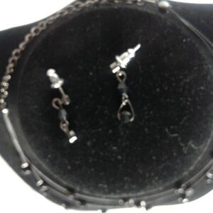Elevate your style with this stunning vintage jewelry set, featuring a triple strand black wire necklace adorned with sparkling crystal beads and matching earrings. The attention to detail and exquisite craftsmanship of this jewelry set make it a must-have for any fashion-forward individual. The strands are delicately woven together to create a unique and elegant design that is sure to turn heads. The earrings complement the necklace perfectly, adding a touch of sophistication to any outfit. This jewelry set is perfect for any occasion and is sure to be a cherished addition to any jewelry collection.