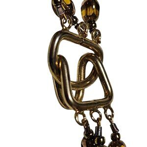 This elegant vintage necklace features three strands of vibrant red and gold beads. The geometric clasp adds a modern touch to its timeless design.