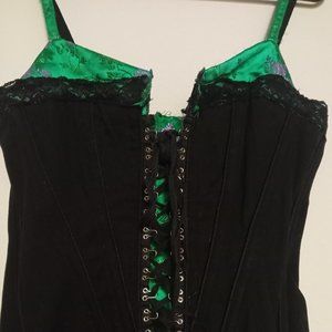 Features adjustable straps and corset ties. Has wire boned corset panels