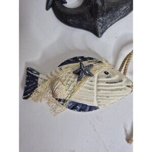 The Vintage Trippie's Nautical Resin Anchors and Distressed Resin Fish is a decorative nautical-themed piece perfect for adults to display in their home. Made with a combination of wood and resin, this unique decor item features a multicolor design with nautical accents like anchors and fish. Ideal for everyday display, this item adds a touch of maritime charm to any living space. Anchors measures 8"×6", Fish measures 5.75"×3. Anchors has some flaws (see pictures). (USC)