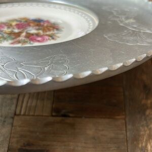 Vintage Triumph Limoges Floral China Platter Farberware Aluminum. Hammered aluminum has a decorative rim and floral etched pattern. Made in Brooklyn NY. Dish is Triumph Limoges Imperial Victorian pattern. Made in USA for Farberware. Vintage piece with scratches from normal age & wear. Look at all photos for wear(close up of the China shows some scratches on the fruit).