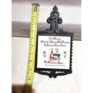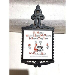 Add a touch of vintage charm to your kitchen décor with this FM cast iron trivet. The tile design features the phrase "Guests Like My Kitchen Best" in bold letters, making it a fun conversation starter for your dinner parties. Made in Japan, this trivet is not only practical but also a collector's item for enthusiasts of retro kitchenware. Perfect for any home chef, this trivet can be used to protect your countertops or tabletops from hot pots and pans. #vintage #trivet #castiron #mcm #vintagetrivet Bin 57