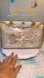 4 Brass feet on the bottom, white Vinyl interior with a 6.5" zippered pouch & an 8.5" vinyl side pocket. Mother of Pearl lucite flap with a gold tone twist clasp closure.