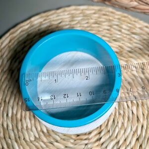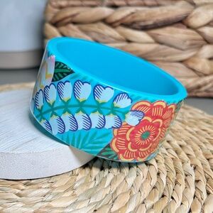 The base of the bracelet is a lovely aqua teal blue acrylic with a colorful floral transfer on the outside. It is a generous 1-1/2 inches wide and about 5mm thick. Approximately 2.75” across