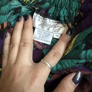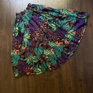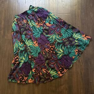 This eye-catching vintage skirt by Kathy Comelli for Shapely features a bold and vibrant tropical leaf print, perfect for making a statement. The pattern showcases a rich mix of emerald green, golden yellow, burnt orange, deep purple, and black, arranged in a lush jungle-like design. The fabric appears to be lightweight and flowy, likely a rayon or cotton blend, offering both comfort and breathability.
