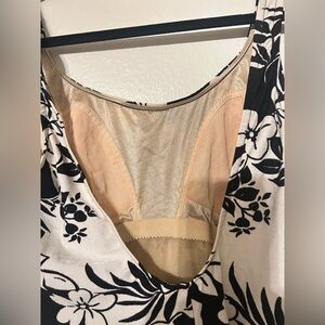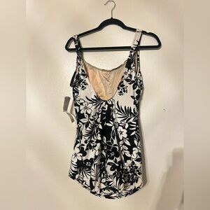 A classy black and white tropical one piece from Maxine of Hollywood. Flattering sinched waist with sweetheart neckline. Low back.