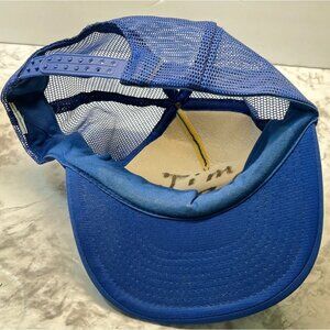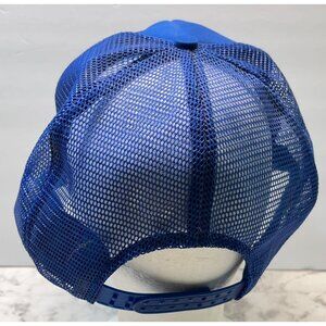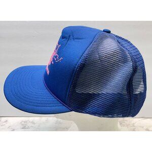 This vibrant blue trucker hat features pink embroidered design and adjustable snapback closure. Durable and lightweight, it offers style and comfort.
