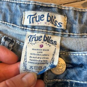 True Bliss denim jean shorts size junior 9. Some small spots on front, see pictures.