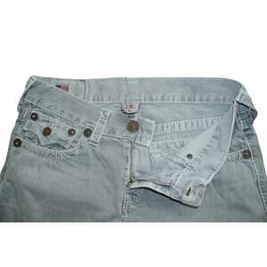 Authentic True Religion Brand Jeans Ricky Oil Dye Straight Leg Denim. Features a faded light wash oil dye finish, five-pocket style, button fly closure, and signature True Religion logo details. Made in the USA. Size 32 waist. Pre-owned in good condition with light wear consistent with use.