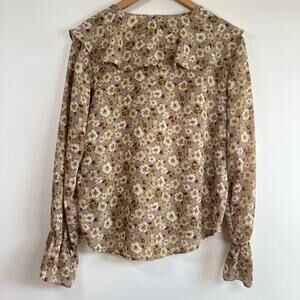 Vintage Try 1 Floral Ruffle Peasant Blouse Pearl Button Beige Brown USA Size M
