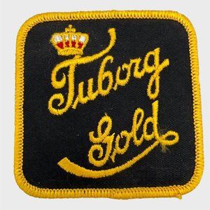Tuborg Gold embroidered patch. Tuborg Gold is a pilsner beer from Carlsberg that is brewed in Denmark. The patch measures approximately 3".