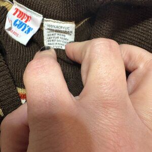 100 percent acrylic. Made in Hong Kong. Brown, tan, white, and reddish wine-colored stripes. Slight V neck and brown collar.