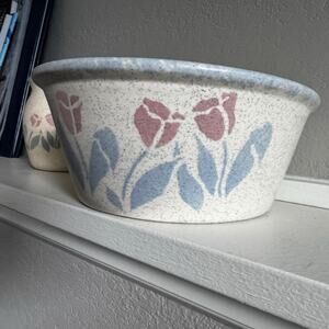 Beautiful 1980s ceramic bowl with a tulip motif in rose and blue tones. The cream glaze has light speckling and a subtle shine, giving it a warm, handmade aesthetic. Ideal for display or everyday serving.