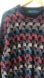 Vintage Tundra Canada sweater in excellent condition with no holes, stains, or pilling. Features a colorful geometric abstract knit pattern in shades of burgundy, teal, and cream on black. Made in Canada, high-quality textured knit with a slouchy, oversized fit perfect for retro 80s or 90s styling. Unisex and cozy for fall and winter layering. Oversized fit. Ribbed collar, hemline and cuffs. 86% Cotton,14% Rayon.