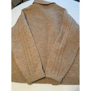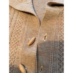100% Virgin wool. Classic knit style in tan. Wooden buttons. Small flaw at bottom hem pictured. Made in Winnipeg, Canada. Pit to pit 22”. Length 26”.