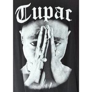 Authentic vintage Tupac Shakur Cross Colours T-shirt in black, featuring an iconic front graphic of Tupac in prayer pose with bold Gothic “Tupac” text.