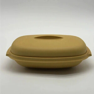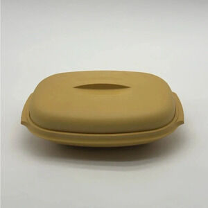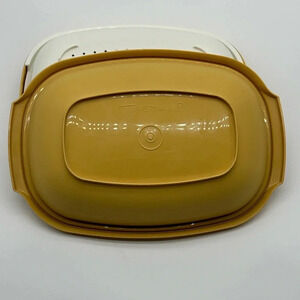 This is a vintage Tupperware (1273-3 bowl , 1275-5 lid, 1274-2 steamer basket, 1276-1 divider)microwave vegetable steamer in a beautiful harvest gold color. The set includes a lid and insert, and has one compartment with one slot. Measuring 12 inches in length, 8 inches in width, and 4 inches in height, this medium-sized steamer is perfect for any kitchen.