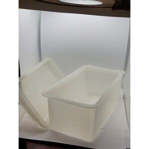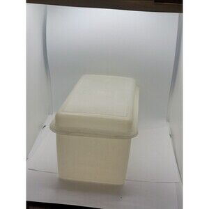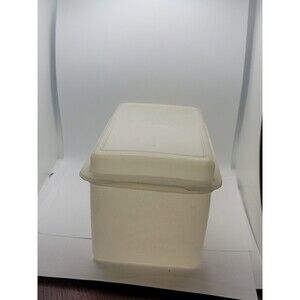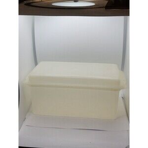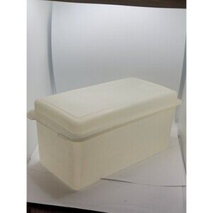 This vintage Tupperware storage container is perfect for storing your favorite loaf of bread. The container is made of durable plastic and comes with a lid to keep your bread fresh. The off-white color and rectangular shape make it a great addition to any kitchen.