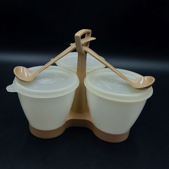 Vintage Tupperware 3 Cup Condiment Caddy Sheer Almond 758 733 Lids 2 Spoons