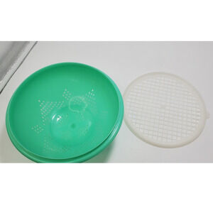 Crafted with convenience in mind, this large Vintage Tupperware 339 Jadite Green Colander Strainer is a practical addition to any kitchen. The round bowl, complemented by a snap on strainer lid 516, is ideal for straining vegetables, pasta, and salad, making it a versatile tool for all occasions. Its durable plastic construction from the 1970s ensures longevity, while the retro style adds a touch of charm to your kitchen decor.