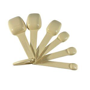 Vintage Tupperware Almond Measuring Spoons Set of 6 on Ring in good preowned condition. Includes two 1 tbs, 1 tsp, 1/2 tsp, 1/4 tsp, and 1/8 tsp.