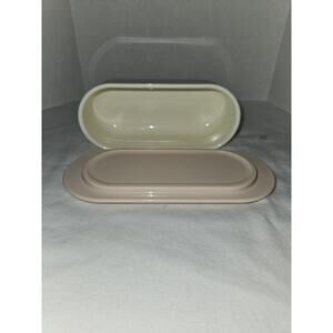 This vintage Tupperware butter dish in rose pink and white is a must-have for any Tupperware collector. With a snap-on lid and a single compartment, it measures 7" in length and 3" in width. The oval shape and single slot make it a unique addition to any kitchen.